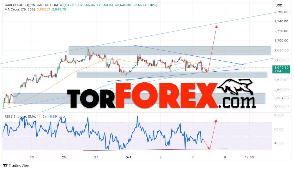 Дополнительным сигналом в пользу роста котировок XAU/USD выступит тест линии поддержки на индикаторе относительной силы. Вторым сигналом станет пробой от нижней границы модели «Треугольник». Отменой варианта подъёма цен на Золото 8 октября 2024 выступит падение цен и пробой уровня 2620. Это укажет на пробой нижней границы бычьего канала и продолжение падения котировок актива в область ниже уровня 2575. Ожидать ускорения роста котировок XAU/USD стоит с пробоем области сопротивления и закрытием цены над уровнем 2675, что укажет на пробой верхней границы модели «Треугольник» и начало реализации паттерна с целями вверху.