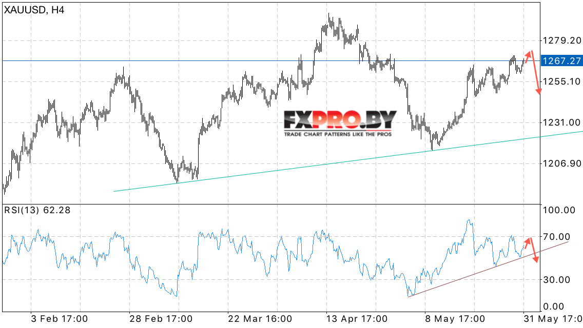 Таким образом, XAU/USD прогноз Форекс цен на Золото на 1 июня 2017 предполагает попытку завершения формирования правого плеча разворотной Форекс модели и начала падения котировок Золота в область ниже уровня 1250, дополнительным сигналом выступит пробой линии поддержки на индикаторе относительной силы.