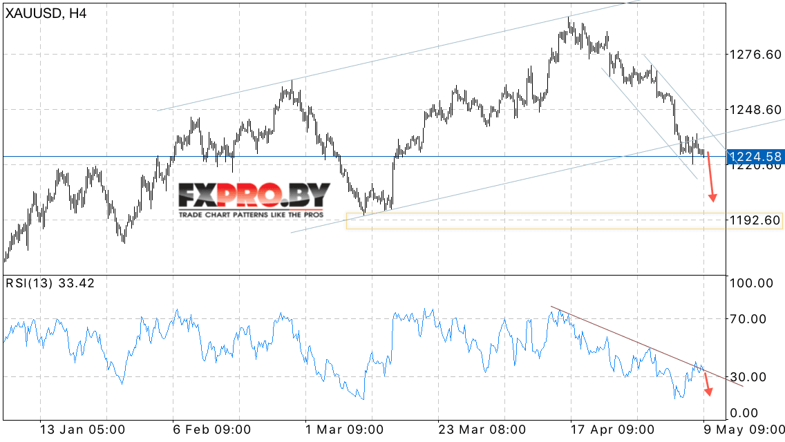 Таким образом, XAU/USD прогноз Форекс цен на Золото на 10 мая 2017 предполагает попытку падения в область ниже уровня 1200 в рамках отскока от нисходящей линии сопротивления на индикаторе относительной силы, отменой станет пробой области 1235.