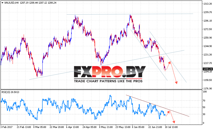 Таким образом, XAU USD прогноз Форекс цен на Золото на 11 июля 2017 предполагает попытку коррекции в область верхней границы нисходящего канала, откуда стоит ожидать продолжения падения ниже уровня 1190, дополнительным сигналом выступит тест линии сопротивления на индикаторе относительной силы.