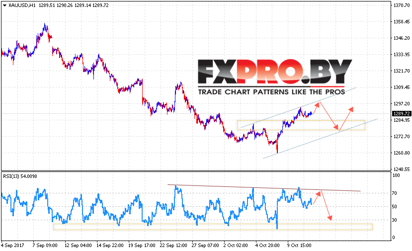 Таким образом, XAU/USD прогноз Форекс цен на Золото на 12 октября 2017 предполагает попытку теста нижней границы канала вблизи области 1275, откуда стоит ожидать продолжения роста цен на Золото выше уровня 1320, отменой варианта роста станет пробой области 1260.