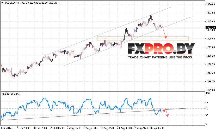 Таким образом, XAU/USD прогноз Форекс цен на Золото на 14 сентября 2017 предполагает попытку пробой границы канала и продолжения снижения в область ниже уровня 1300, дополнительным сигналом в пользу снижения выступит тест пробитой линии тренда на индикаторе относительной силы.