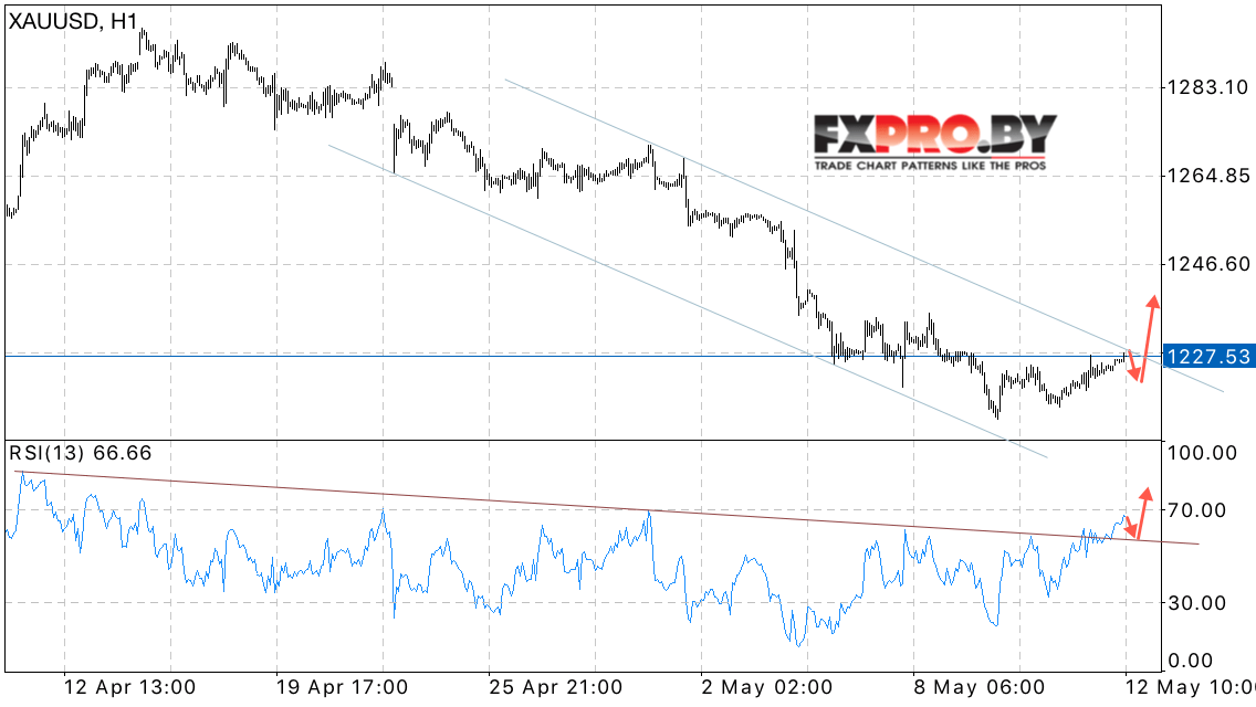 Котировки Золота XAU/USD продолжают движение в рамках нисходящей тенденции, однако на данный момент есть потенциал для пробоя верхней границы канала и теста области выше уровня 1235.