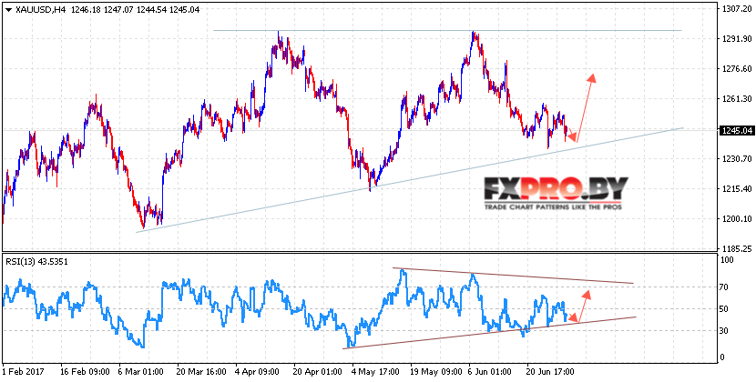 Таким образом, XAU/USD прогноз Форекс цен на Золото на 30 июня 2017 предполагает попытку продолжения роста в область выше уровня 1265, дополнительным сигналом выступит плотный тест линии поддержки на индикаторе относительной силы, отменой станет пробой нижней границы модели Треугольник.