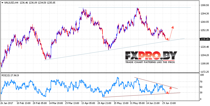 Таким образом, XAU/USD прогноз Форекс цен на Золото на 4 июля 2017 предполагает попытку отскока от нижней границы восходящего Треугольника с целью роста на уровне 1260, дополнительным сигналом в пользу роста выступает тест линии поддержки на индикаторе относительной силы.
