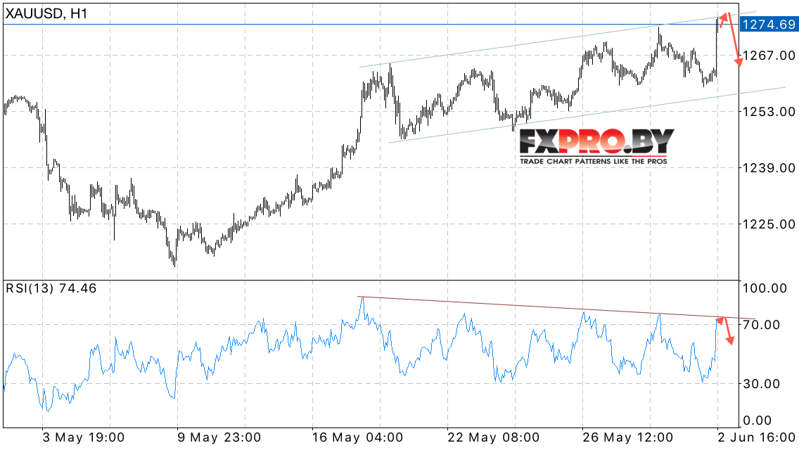 Таким образом, XAU/USD прогноз Форекс цен на Золото на 5 июня 2017 предполагает попытку падения котировок в область ниже уровня 1265, в пользу падения выступает тест линии тренда на индикаторе относительной силы, отменой варианта падения станет сильный рост и пробой области 1280.