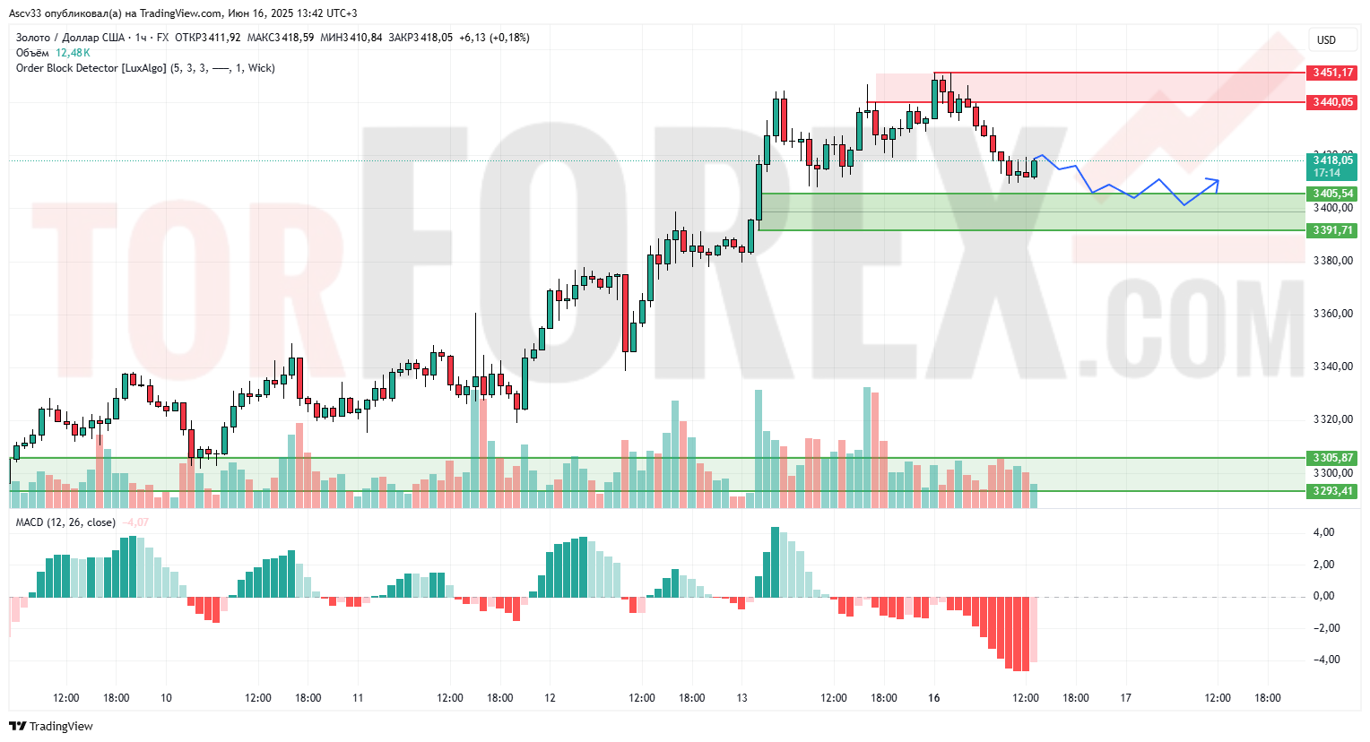 Ожидается коррекция в область 3 405–3 392 с последующим формированием консолидации. При удержании этой зоны и стабилизации MACD возможен повторный рост в сторону 3 440. При пробое поддержки актуализируется сценарий снижения к 3 305.