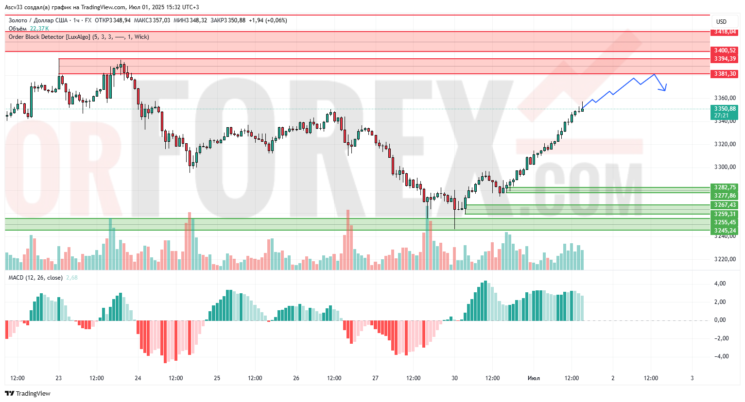 Цена может достичь зоны 3380–3400, где вероятна краткосрочная консолидация или коррекция. При откате ближайшая цель — поддержка 3280–3267. В случае пробоя вверх следующая цель — 3415.