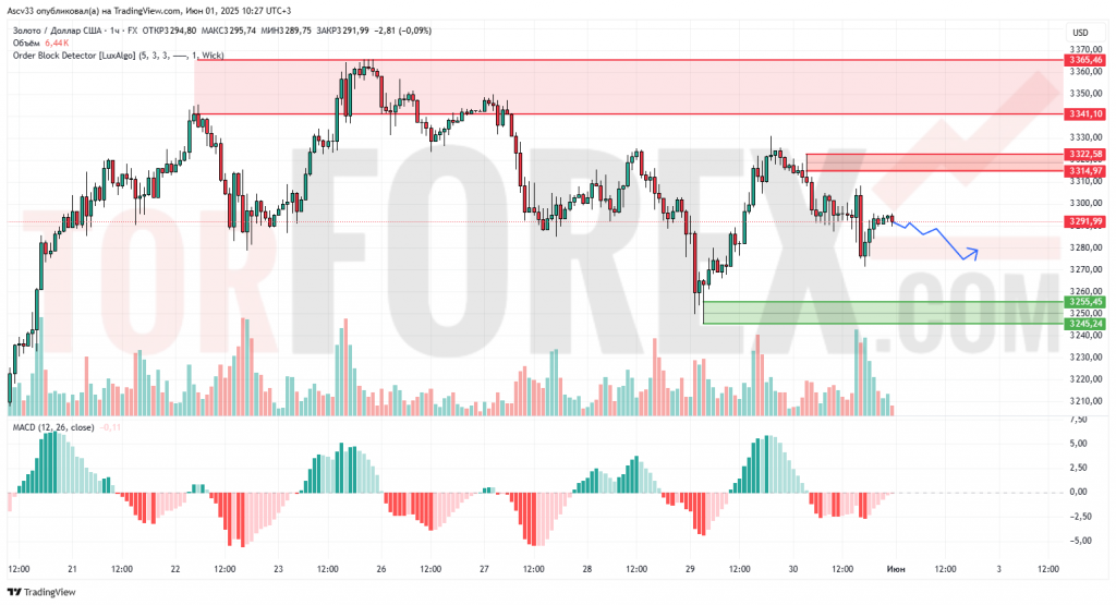 Золото не смогло преодолеть зону сопротивления в районе 3 315–3 322 и демонстрирует признаки слабости. Цена постепенно скатывается ниже уровня 3 300, а MACD уходит в отрицательную зону — это сигнал на возможное развитие коррекционного движения. Объёмы при этом остаются умеренными, что указывает на отсутствие инициативы со стороны покупателей.