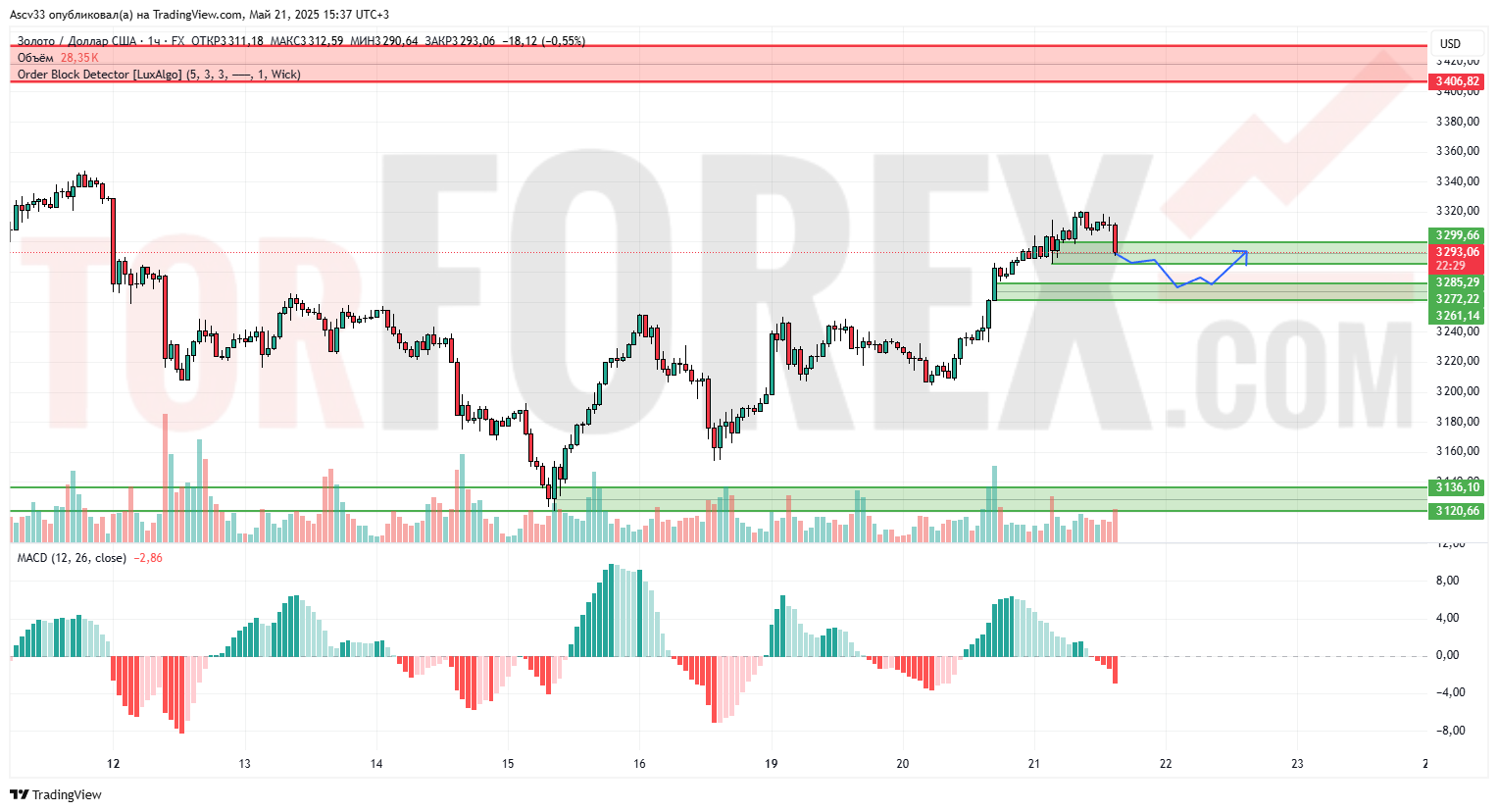 Золото не смогло преодолеть сопротивление в районе 3 299–3 312 и демонстрирует коррекционное движение. После роста на повышенных объёмах наблюдается снижение интереса со стороны покупателей. MACD пересёк нулевую линию сверху вниз, что указывает на начало коррекционной фазы. Текущая цена приближается к поддержке 3 285, где возможна стабилизация или краткосрочный отскок.