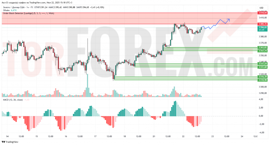 Ожидается тест уровня 3400 с возможным ложным пробоем и возвратом к 3360–3357. В случае уверенного пробоя 3418 рост может ускориться. Наиболее вероятный сценарий — боковое движение в диапазоне 3360–3410 с попыткой роста.