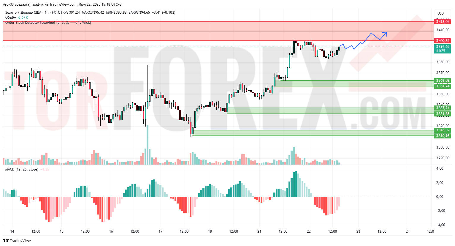 3363.0–3357.7 — ближайшая зона, откуда произошёл текущий рост. Более глубокие уровни поддержки находятся в диапазонах 3337.2–3331.6 и 3316.3–3310.9, где ранее формировались сильные объёмы.