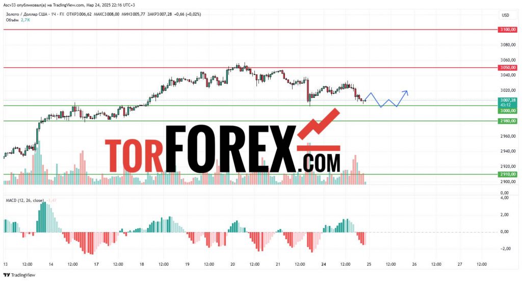 Ожидается, что XAU/USD останется в пределах 3000–3050 USD 25 марта. Пробой 3050 USD вверх может подтвердить восходящее движение, в то время как закрытие ниже 2980 USD может усилить медвежьи настроения. Трейдерам рекомендуется внимательно следить за изменениями цены вблизи этих ключевых уровней, так как их прорыв может значительно повлиять на дальнейшие действия на рынке золота.