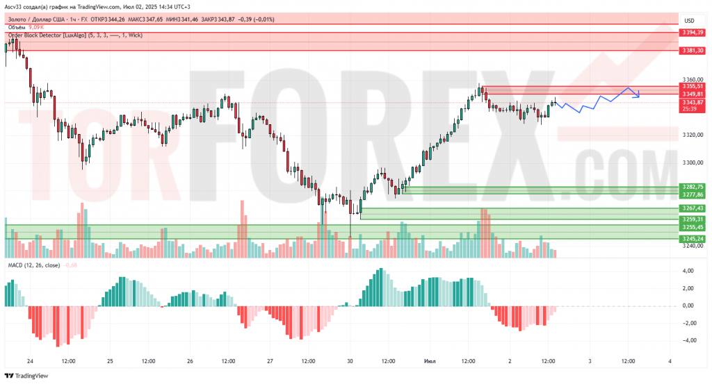 Золото демонстрирует уверенное восстановление после снижения, однако сейчас движется к области предложения 3349.81–3355.51, где уже ранее проявлялись продавцы. Движение проходит на фоне снижающихся объёмов, что указывает на возможное замедление восходящего импульса. Индикатор MACD сбавил темп роста и близок к пересечению линии сигнала, что может сигнализировать о скорой коррекции.