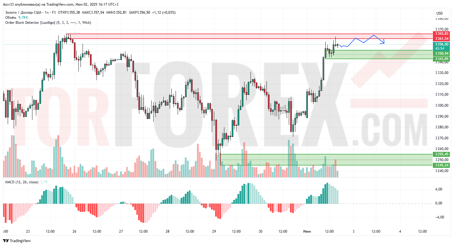 Золото демонстрирует восходящее движение после сильного отскока от зоны поддержки 3245–3255. Рост приостановился на зоне сопротивления 3361–3365, где началась консолидация. Индикатор MACD остаётся в положительной зоне, что подтверждает наличие бычьего импульса, однако объёмы начали снижаться.