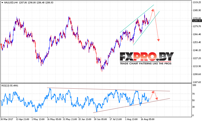 Таким образом, XAU/USD прогноз цен на Золото на 24 августа 2017 предполагает попытку роста в рамках завершения модели Клин, ожидать начала падения стоит с пробоем уровня 1280.