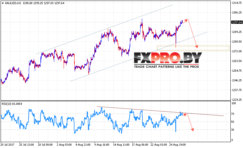 Таким образом, XAU/USD прогноз цен на Золото на 29 августа 2017 предполагает попытку падения с целью вблизи уровня 1275, дополнительным сигналом в пользу снижения выступает тест линии сопротивления на индикаторе относительной силы, отменой станет сильный рост и пробой уровня 1305.