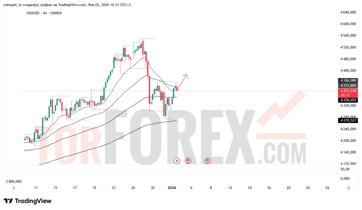 На 3 января 2026 года XAU/USD сохраняет нейтрально-бычью структуру с признаками устойчивого восстановления. Основной сценарий — рост к 4 423–4 460 USD при пробое зоны сопротивления. Альтернативный сценарий — откат к 4 320–4 270 USD при отказе от уровня 4 376.25 USD.
