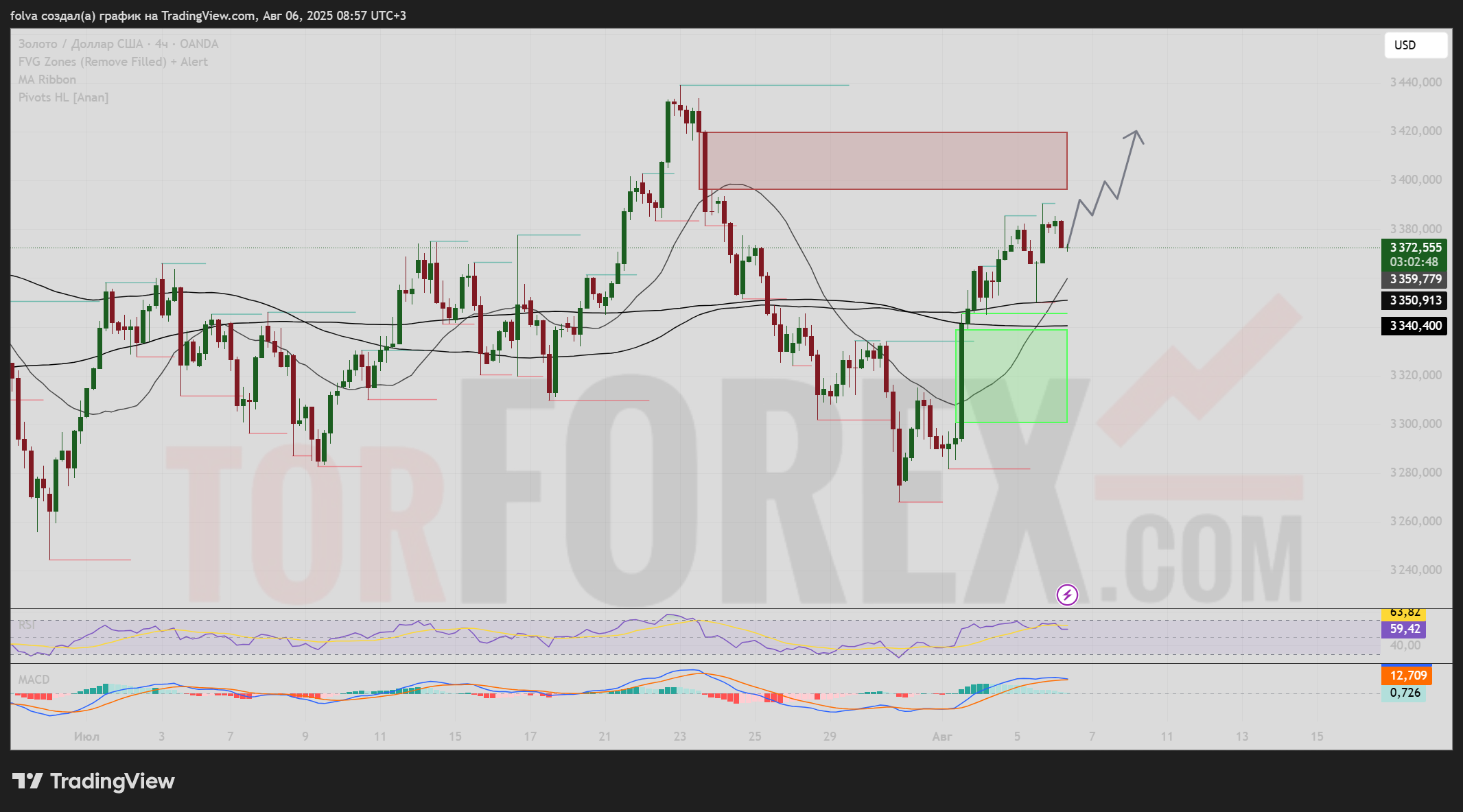 Торговая пара XAU/USD (золото к доллару США) демонстрирует уверенное восстановление после предыдущей коррекции. После выхода из области спроса в районе $3340 золото закрепилось выше ключевых EMA и на текущий момент торгуется вблизи $3373. При этом цена подошла вплотную к FVG-зоне предложения, что повышает вероятность замедления восходящего импульса. В данной аналитике рассмотрим техническую структуру рынка, сигналы индикаторов и возможные торговые сценарии на 7 августа 2025 года.
