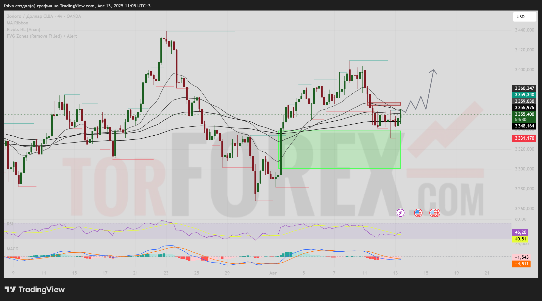 После достижения вершины в районе 3 409 котировки золота снизились, пробив EMA20 и EMA50, и лишь в зоне 3 331–3 341 нашли поддержку. Эта область совпадает с нижней границей активного FVG, что усиливает её значимость.