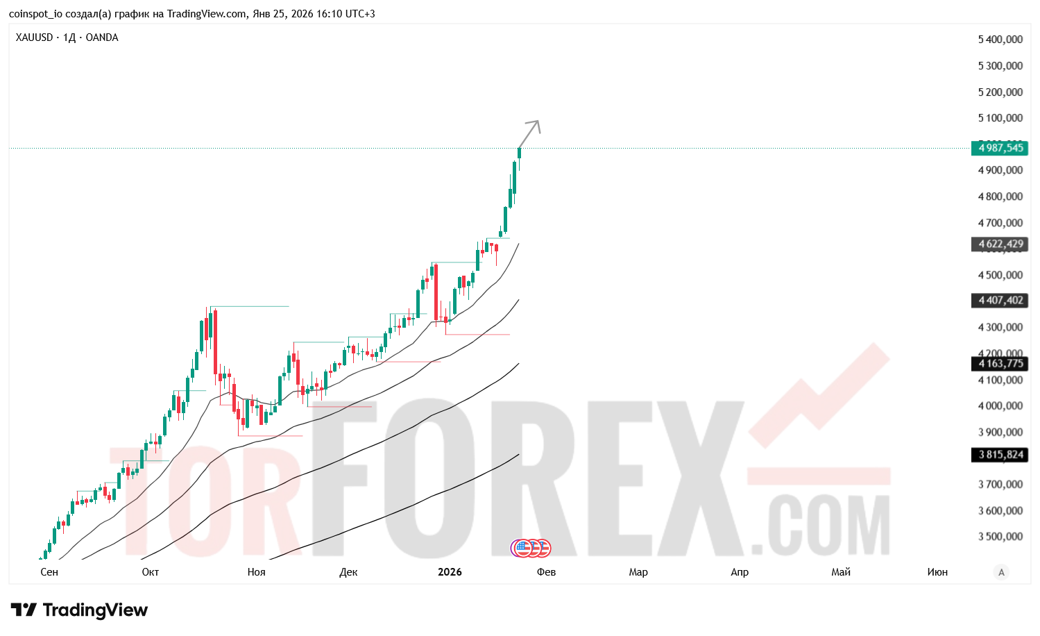 На неделю 25 января – 1 февраля 2026 года XAU/USD сохраняет бычью структуру с признаками импульсного расширения. Основной сценарий — рост к 5 060–5 090 USD при пробое зоны сопротивления. Альтернативный сценарий — откат к 4 940–4 900 USD при отказе от уровня 5 000.