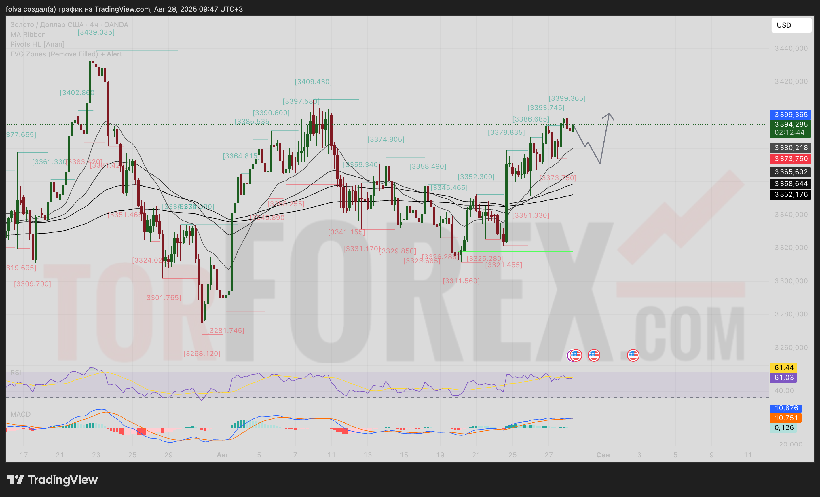 FVG зоны (Fair Value Gaps) отмечают несбалансированные области в районе 3350-3360 и 3420-3430, которые могут выступать как магниты для цены. Особое внимание заслуживает зона 3380-3390, где сформировался значимый дисбаланс, требующий закрытия.