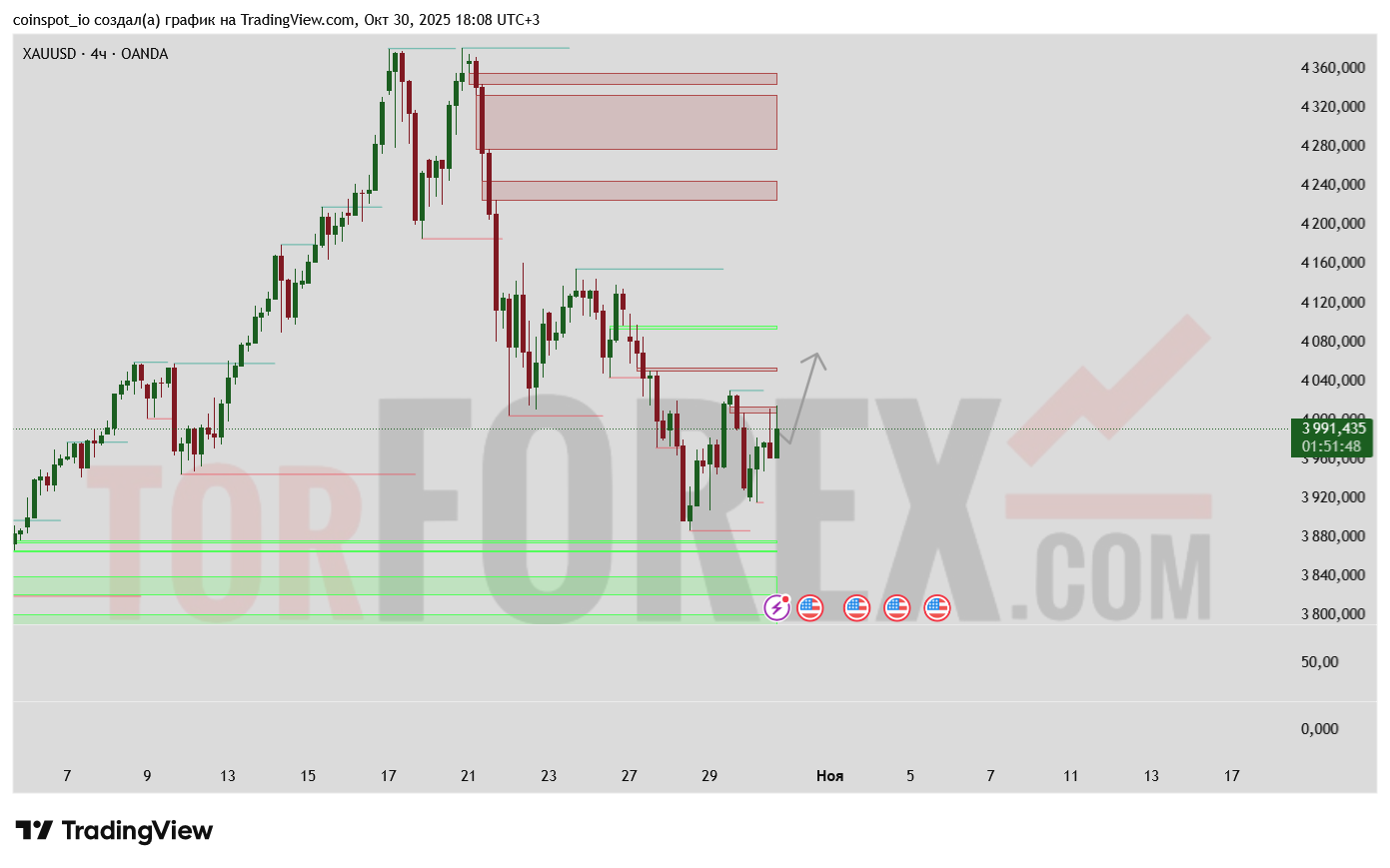 На 31 октября 2025 года XAU/USD демонстрирует признаки устойчивого восходящего импульса. Основная торговая идея — поиск входа на откате к зоне $3,975–$3,980 с целями в районе $4,030–$4,060. Альтернативный сценарий — при пробое $3,975 вниз рассматривать коррекционное движение к $3,950, где возможен отскок от зоны поддержки.