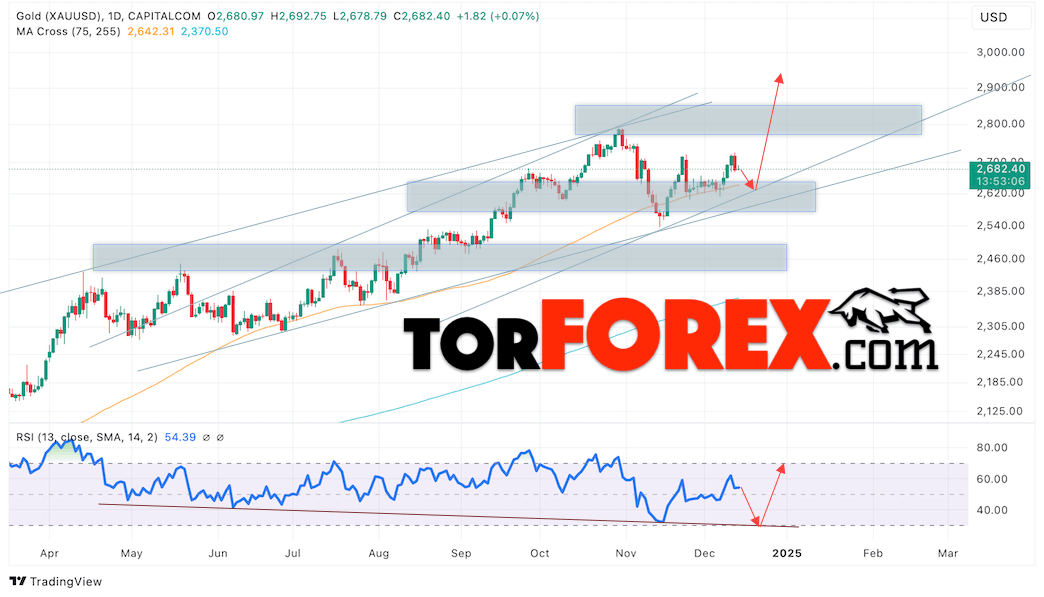 Дополнительным сигналом в пользу снижения котировок XAU/USD выступит тест линии сопротивления на индикаторе относительной силы. Вторым сигналом станет пробой от нижней границы бычьего канала, который был пробит продавцами вниз. Отменой варианта падения цен на неделе 16 — 20 декабря 2024 выступит сильный рост цен и пробой уровня 2775. Это укажет на пробой нижней границы бычьего канала и продолжение роста котировок актива в область выше уровня 2865. Ожидать ускорения падения котировок XAU/USD стоит с пробоем области поддержки и закрытием цены под уровнем 2595, что укажет на пробой нижней границы очередного бычьего канала.