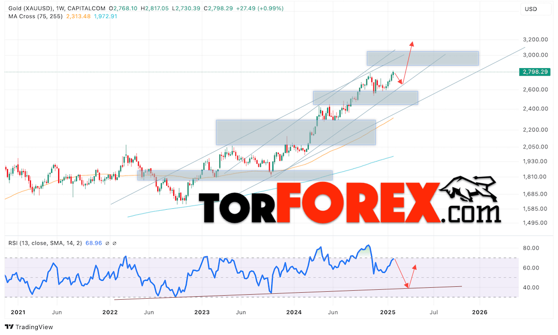 Котировки XAUUSD торгуется в рамках роста и начала отработки модели «Треугольник». В начале января 2024 года цена Золота составляет 2798 Долларов за Тройскую Унцию. Скользящие средние указывают на наличие бычьей тенденции. Цены пробили область между сигнальными линиями вверх, что указывает на давление со стороны покупателей актива и потенциальное продолжение роста уже с текущих уровней. В рамках прогноза цены Золота на февраль 2025 года года стоит ожидать попытку развития медвежьей коррекции и тест уровня поддержки вблизи области 2735. Откуда стоит ожидать отскок вверх и продолжение подъёма цены на Золото с потенциальной целью выше уровня 3205.