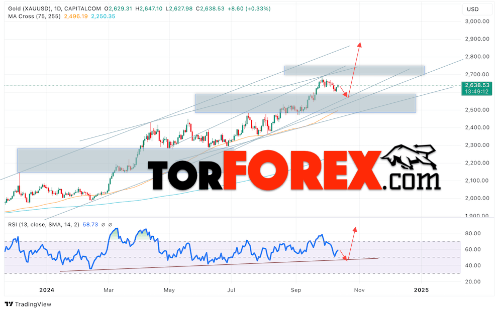 Дополнительным сигналом в пользу подъёма котировок XAU/USD выступит тест линии поддержки на индикаторе относительной силы. Вторым сигналом станет пробой от нижней границы бычьего канала. Отменой варианта роста цен на 14 — 18 октября 2024 выступит падение цен и пробой уровня 2540. Это укажет на пробой нижней границы канала и продолжение снижения котировок актива в область ниже уровня 2475. Ожидать ускорения роста котировок XAU/USD стоит с пробоем области сопротивления и закрытием цены над уровнем 2705.