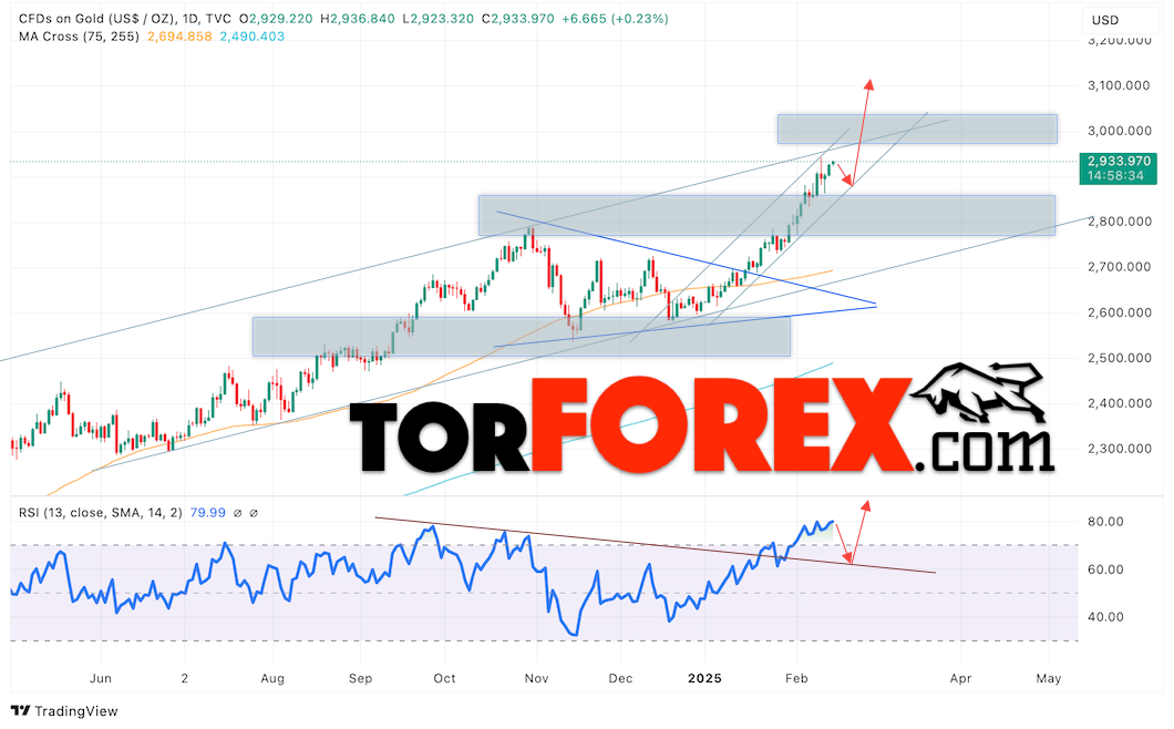 Дополнительным сигналом в пользу роста котировок XAU/USD выступит тест линии поддержки на индикаторе относительной силы. Вторым сигналом станет пробой от верхней границы бычьего канала. Отменой варианта роста цен на 17 — 21 февраля 2025 выступит падение цен и пробой уровня 2835. Это укажет на пробой нижней границы бычьего канала и продолжение падения котировок актива в область ниже уровня 2765. Ожидать ускорения роста котировок XAU/USD стоит с пробоем области сопротивления и закрытием цены над уровнем 2975.