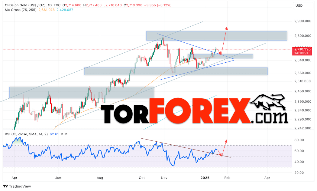 Котировки XAUUSD завершают торговую неделю в рамках развития подъёма и начала реализации модели «Треугольник». В момент публикации прогноза цена Золота на сегодня составляет 2710 Долларов за Тройскую Унцию. Скользящие средние указывают на наличие краткосрочной бычьей тенденции. Цены пробили область между сигнальными линиями вверх, что указывает на давление со стороны покупателей актива и потенциальное продолжение роста уже с текущих уровней. В рамках прогноза цены Золота на неделю стоит ожидать попытку развития медвежьей коррекции и тест уровня поддержки вблизи области 2675. Откуда стоит ожидать отскок вверх и продолжение подъёма цены на Золото с потенциальной целью выше уровня 2845.