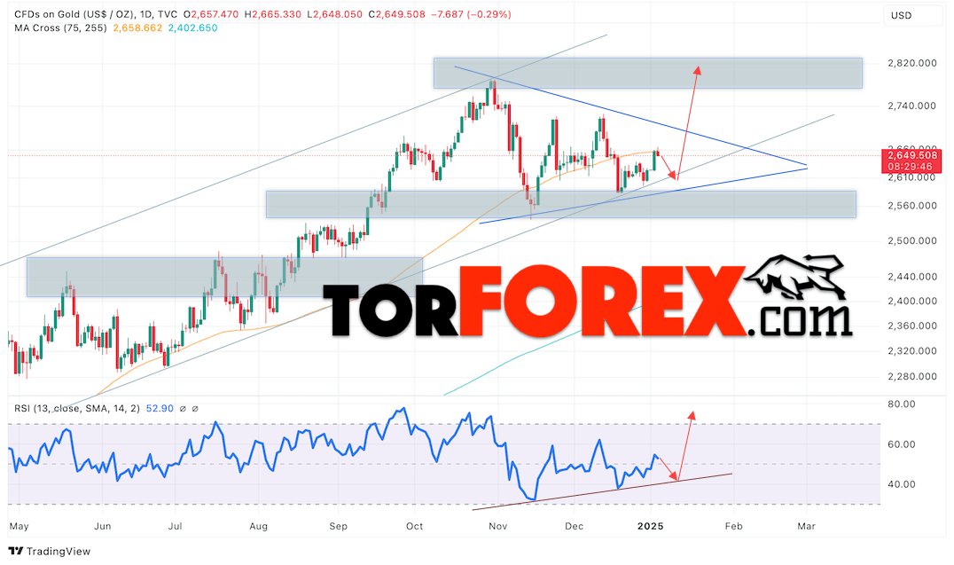 Котировки XAUUSD завершают торговую неделю в рамках развития подъёма и формирования модели «Треугольник». В момент публикации прогноза цена Золота на сегодня составляет 2649 Долларов за Тройскую Унцию. Скользящие средние указывают на наличие краткосрочной бычьей тенденции. Цены вновь тестируют область между сигнальными линиями, что указывает на давление со стороны покупателей актива и потенциальное продолжение роста уже с текущих уровней. В рамках прогноза цены Золота на неделю стоит ожидать попытку развития медвежьей коррекции и тест уровня поддержки вблизи области 2610. Откуда стоит ожидать отскок вверх и продолжение подъёма цены на Золото с потенциальной целью выше уровня 2825.