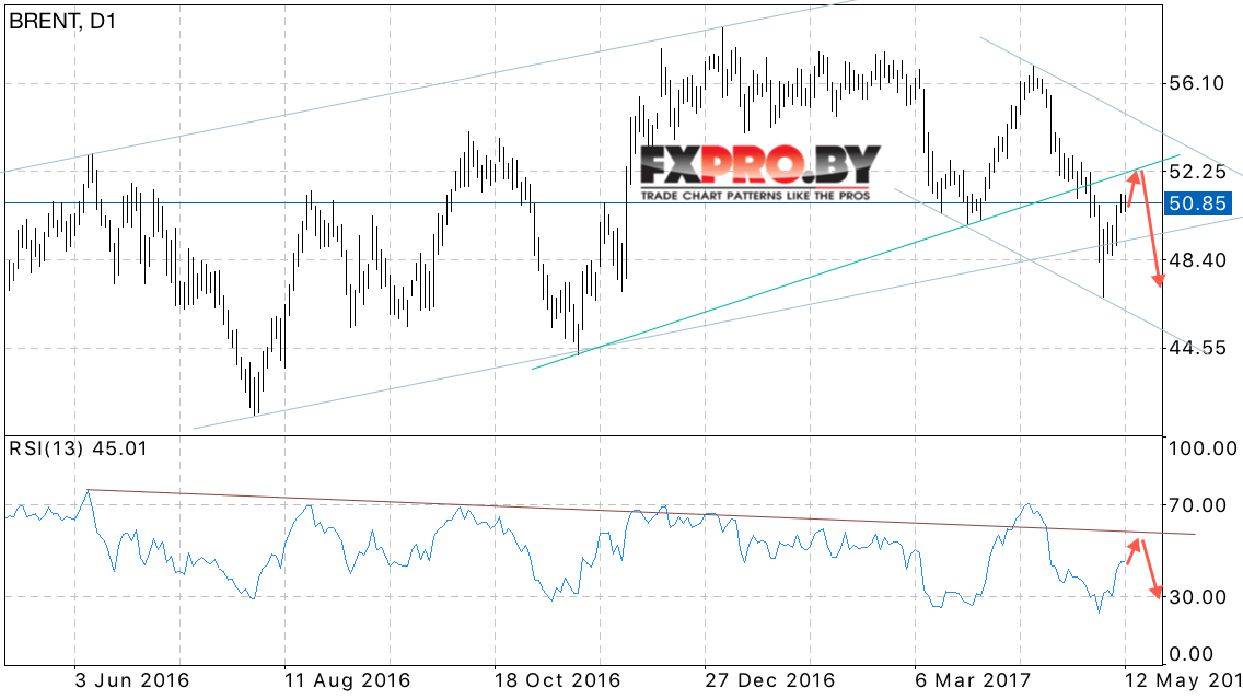 Таким образом, BRENT прогноз цен на нефть на неделю 15 — 19 мая 2017 предполагает попытку продолжения развития восходящей коррекции в область на уровне 52 долларов за баррель, откуда стоит ожидать отскок и падения котировок нефти область ниже уровня 48 долларов за баррель, отменой снижения стане пробой области 55 долларов за баррель.