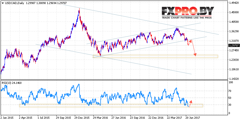 Таким образом, Канадский Доллар прогноз на неделю 3 — 7 июля 2017 предполагает попытку коррекции в область пробитого канала, откуда стоит ожидать продолжения снижения с потенциальной целью вблизи уровня 1.25, отменой может стать пробой уровня 1.33, что укажет на возврат котировок внутрь восходящего канала.