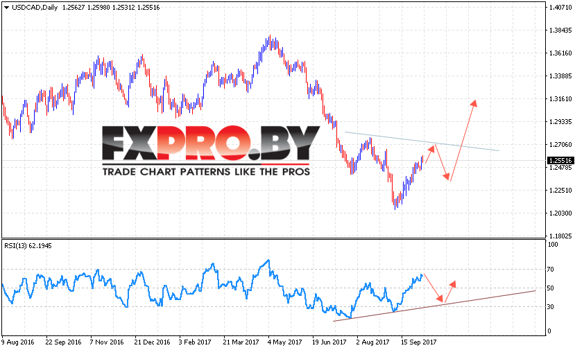 Таким образом, Канадский Доллар USD/CAD прогноз на 9 — 13 октября 2017 предполагает попытку теста уровня 1.27, откуда стоит ожидать отскок и снижения котировок пары с целью вблизи уровня 1.2450 в рамках формирования разворотной модели Голова и плечи, дополнительным сигналом в пользу роста от уровня 1.2450 выступит тест линии тренда на индикаторе относительной силы.