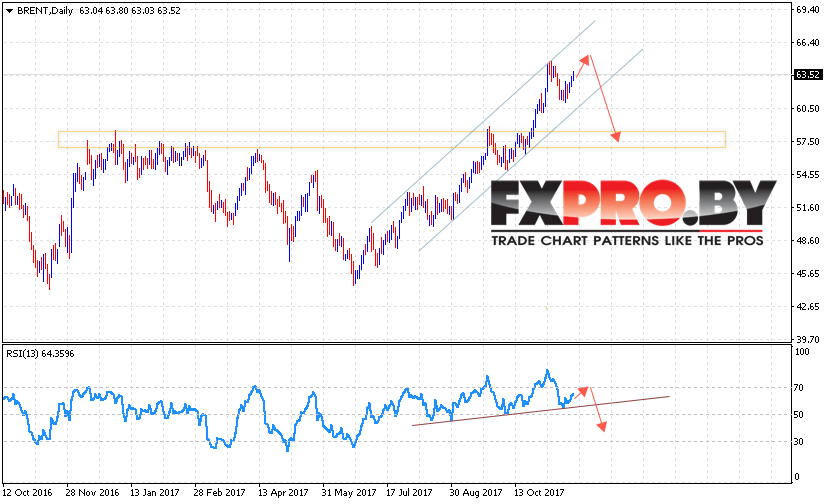 Таким образом, Прогноз цен на нефть BRENT на 27 ноября — 1 декабря 2017 предполагает попытку теста уровня 65, откуда стоит ожидать начала падения нефти, дополнительным сигналом в пользу снижения цены нефти выступает формирование модели «Неудавшийся размах» на индикаторе относительной силы.