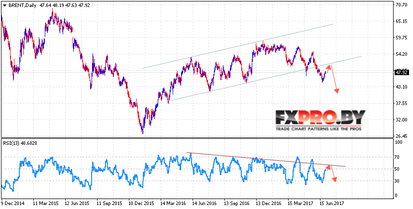 Котировки нефти марки BRENT завершают торговую неделю вблизи области 48 долларов за баррель. Стоит ожидать попытку теста пробитой границы восходящего канала на уровне 50 долларов за баррель. Откуда вновь будет потенциал для продолжения снижения цен на нефть в область ниже уровня 40 долларов за баррель.