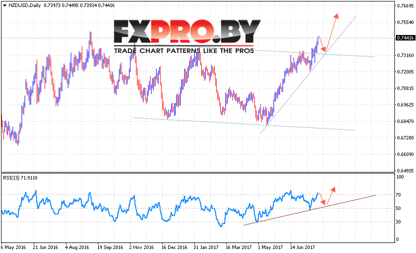 Таким образом, Технический анализ Форекс NZD USD на 24 — 28 июля 2017 предполагает попытку коррекции в область пробитой границы канала, откуда вновь стоит ожидать отскок и продолжение роста пары с целью выше уровня 0.760.