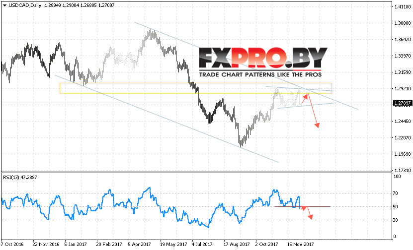 В пользу продолжения падения пары выступает формирование разворотной модели «Неудавшийся размах» на индикаторе относительной силы. Отменой варианта продолжения снижения котировок USD/CAD на текущей торговой неделе станет сильный рост и пробой области 1.3060, что укажет на продолжение роста Канадского Доллара и отмену нисходящей модели.