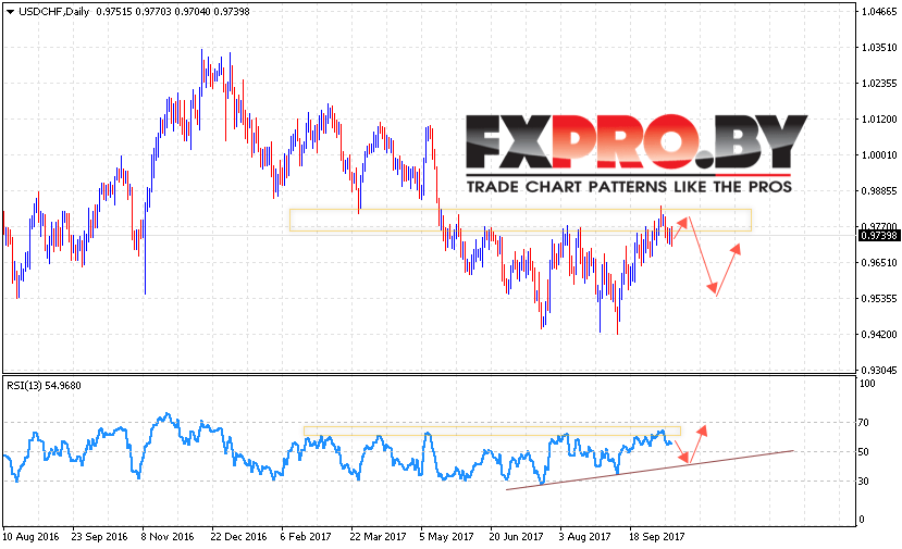 Таким образом, USD CHF прогноз Доллар Франк на 16 — 20 октября 2017 предполагает попытку отскока от уровня сопротивления и продолжения падения с потенциальной целью вблизи области 0.9550, в пользу падения выступает тест области сопротивления на индикаторе относительной силы, отменой варианта падения USD/CHF станет пробой области 0.9910.