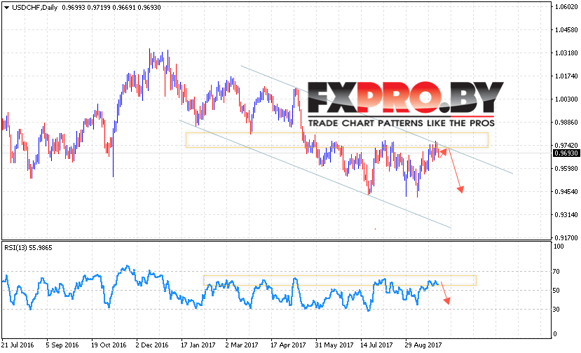 Таким образом, USD CHF прогноз Доллар Франк на 2 — 6 октября 2017 предполагает попытку отскока от верхней границы нисходящего канала и продолжения падения с потенциальной целью вблизи области 0.9450, в пользу падения выступает тест уровня сопротивления на индикаторе относительной силы, отменой станет пробой области 0.9860.