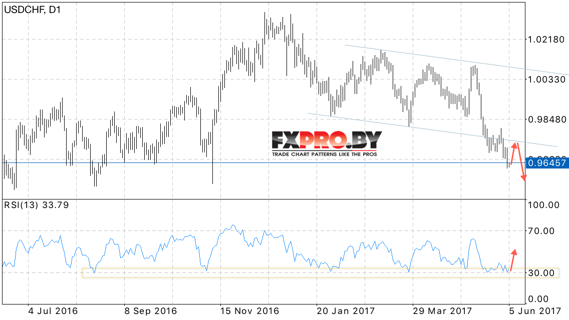 Таким образом, USD CHF прогноз Доллар Франк на 5 — 9 июня 2017 предполагает попытку теста пробитой границы нисходящего канала и продолжения падения в область ниже уровня 0.94, в пользу роста выступает тест области поддержки на индикаторе относительной силы.