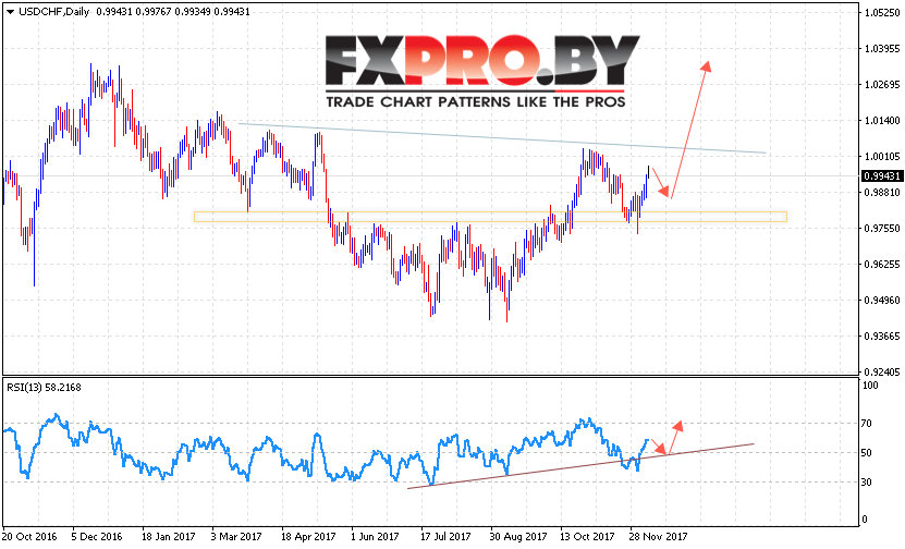 Таким образом, USD CHF прогноз Форекс на неделю 11 — 15 декабря 2017 предполагает попытку теста уровня 0.9880 и начала роста USD/CHF в область выше уровня 1.0250, в пользу роста пары выступает тест линии поддержки на индикаторе относительной силы, отменой варианта роста USD/CHF станет пробой уровня 0.9450.