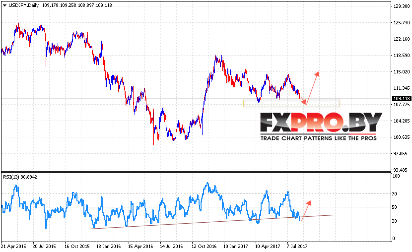 В пользу роста пары выступает тест линии поддержки на индикаторе относительной силы. Отменой варианта роста пары USD/JPY на текущей торговой неделе станет падение и пробой области 107.30, что укажет на продолжение снижения пары. Ожидать ускорения роста пары Доллар Иена стоит с пробоем уровня 115.50.