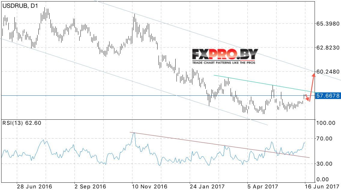 Таким образом, USD RUB прогноз курса Доллара на 19 — 23 июня 2017 предполагает попытку продолжения роста в область выше уровня 60 рублей за доллар США в рамках начала отработки разворотной модели Голова и плечи, отменой станет пробой уровня 55 рублей за доллар США, что укажет на продолжение снижения котировок пары.