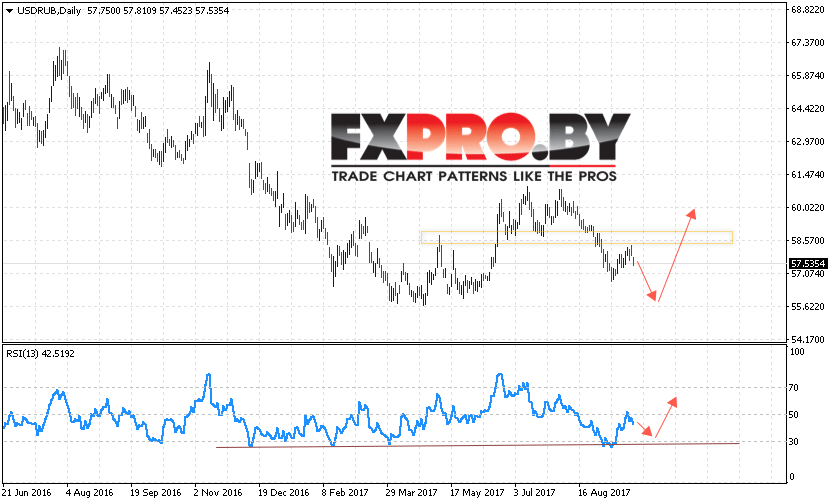 Таким образом, USD RUB прогноз курса Доллара на 25 — 29 сентября 2017 предполагает попытку снижения в область 55.70, откуда стоит ожидать отскок и рост котировок Доллар Рубль в рамках отработки разворотной модели на индикаторе относительной силы, отменой роста выступит падение и пробой области 55.