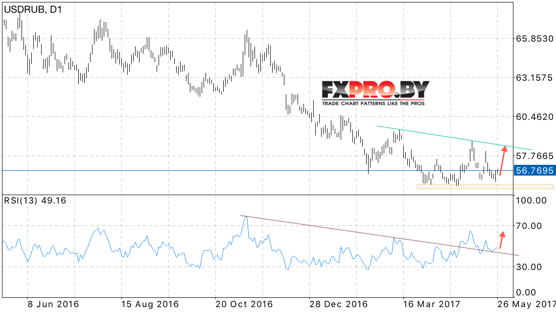 Таким образом, USD RUB прогноз курса Доллара на 29 мая 2017 — 2 июня 2017 предполагает попытку отскока от области поддержки и начала роста в область выше уровня 58 рублей за доллар США в рамках отработки разворотной модели Голова и плечи, дополнительным сигналом в пользу роста выступает тест пробитой линии поддержки на индикаторе относительной силы.