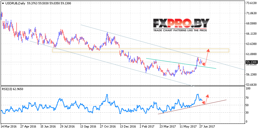 Таким образом, USD RUB прогноз курса Доллара на неделю 3 — 7 июля 2017 предполагает попытку коррекции в область пробитой линии Шеи, откуда стоит ожидать продолжение роста пары в область выше уровня 62 рублей за доллар США, дополнительным сигналом выступит плотный тест линии поддержки на индикаторе относительной силы.