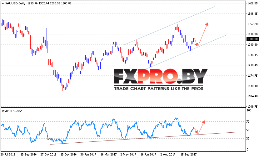 Котировки Золота XAU/USD завершают торговую неделю вблизи области 1300. Котировки продолжают движение в рамках восходящей коррекции. На данный момент Золото оттолкнулось от нижней границы канала, стоит ожидать рост котировок выше уровня 1350.